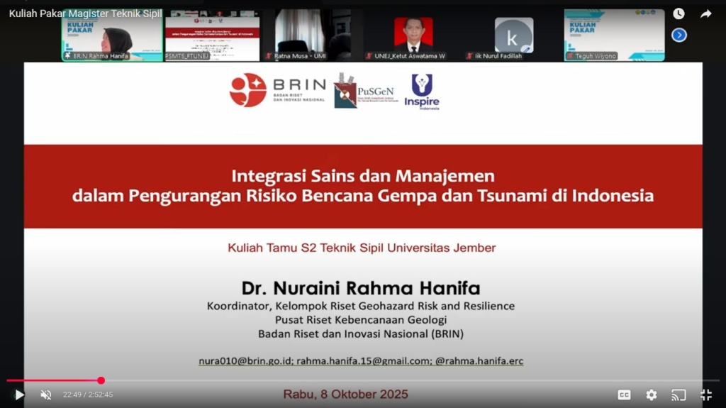 Terima kasih kepada Ibu Nurani Rahma, S.T., M.T., D.Sc. dari Pusat Riset Kebencanaan Geoteknologi, BRIN yang telah berkenan memberikan materi dalam Kuliah Pakar bertema “Integrasi Sains dan Manajemen dalam Pengurangan Risiko Bencana Gempa dan Tsunami di Indonesia” pada tanggal 8 Oktober 2025.